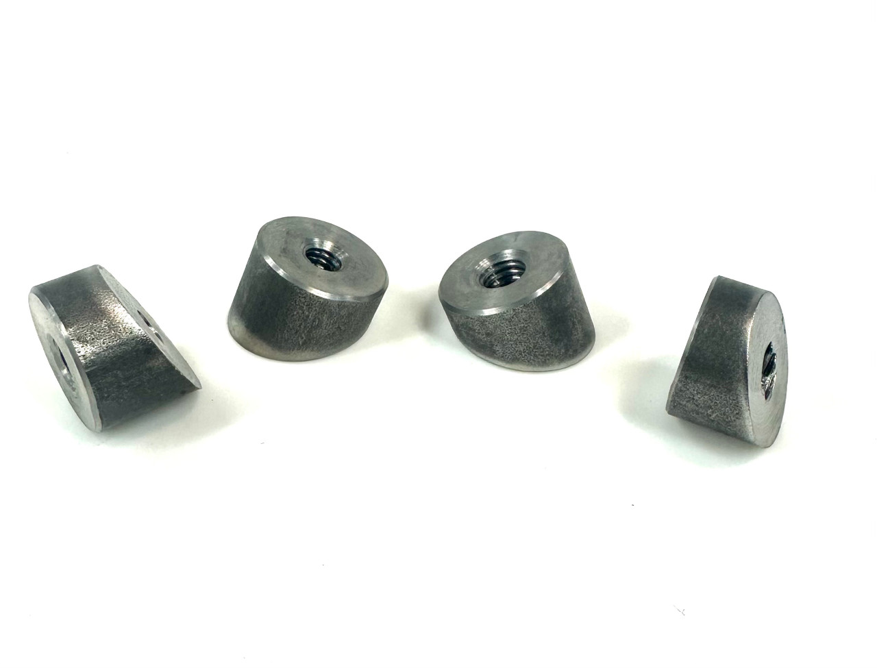 These tapered seat bugs are used to attach the springs for a sprung seat when a flat bung will not work. The tapered side gets welded to the seat pan to help create a more parallel orientation for the seat spring for a reduction in spring bind.